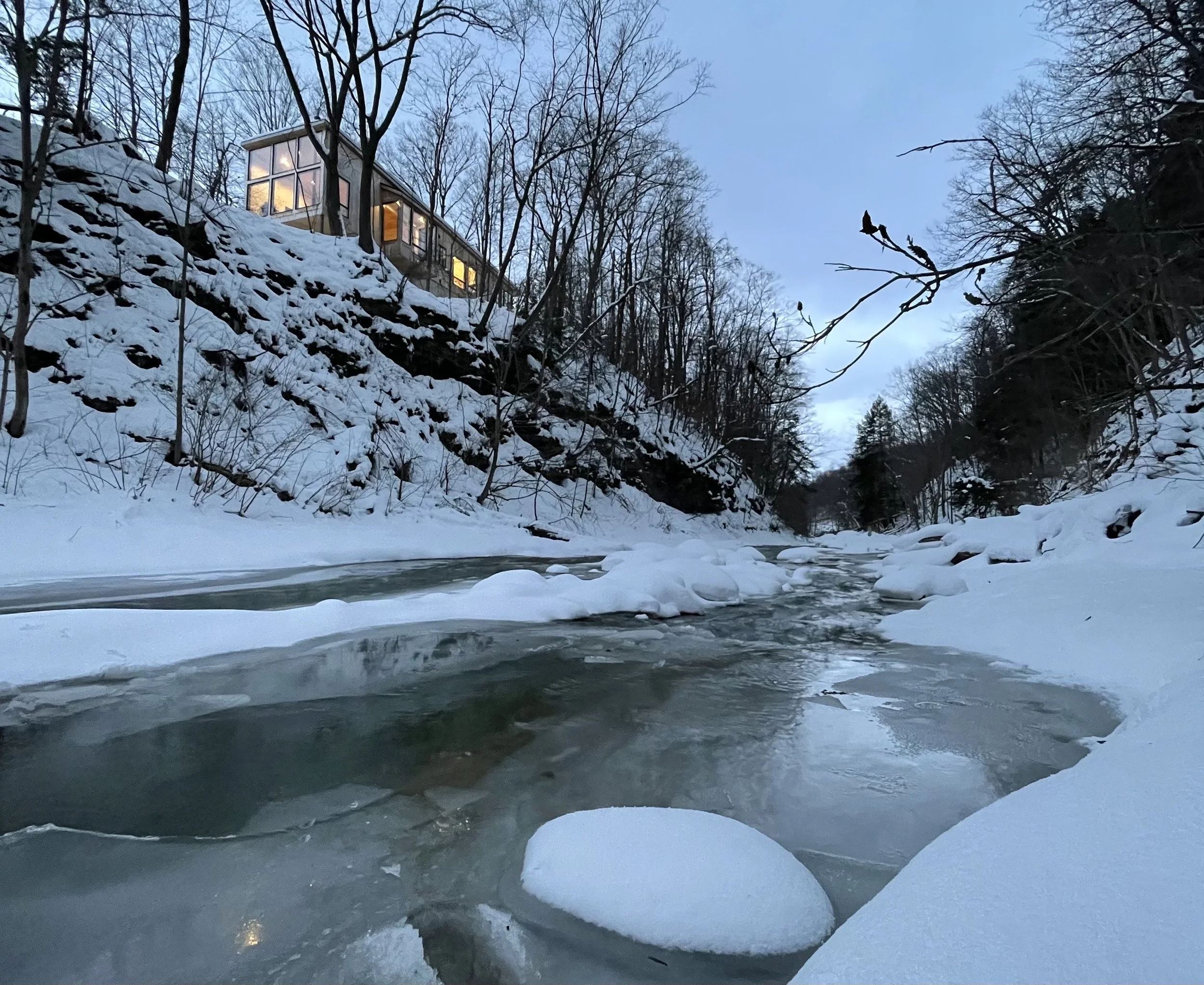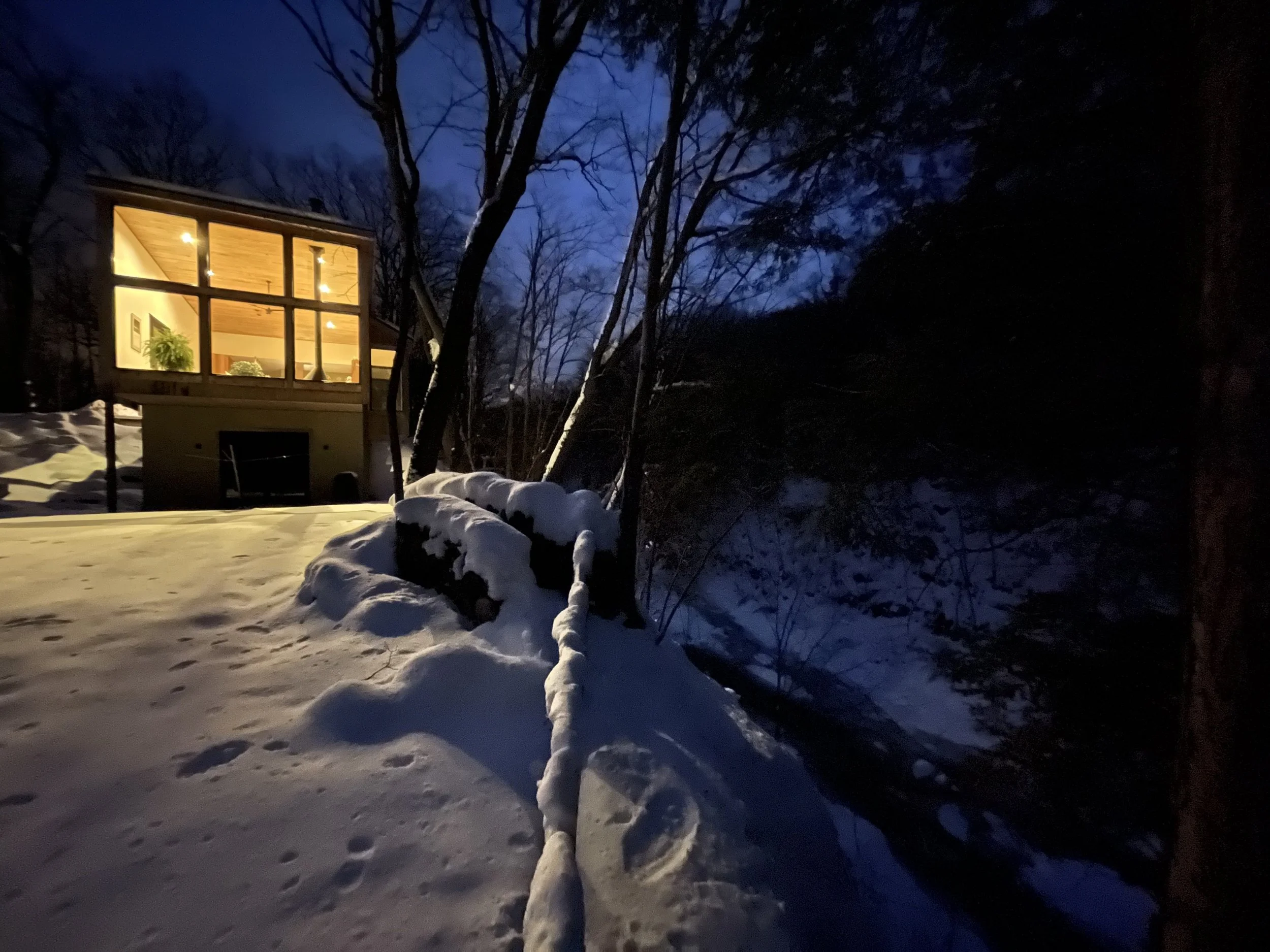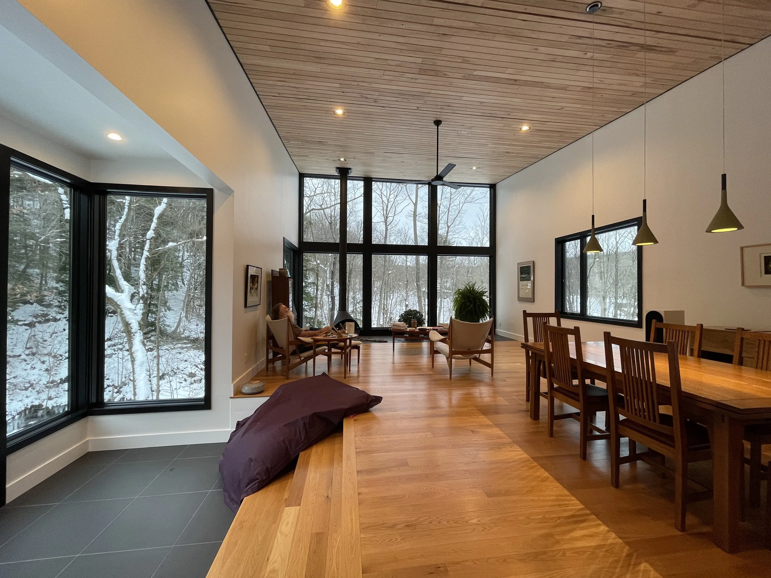 A memorable pilgrimage, Cliff House fulfills the owner's desire for a minimalist framework in nature to enjoy music, sustenance and conversation.