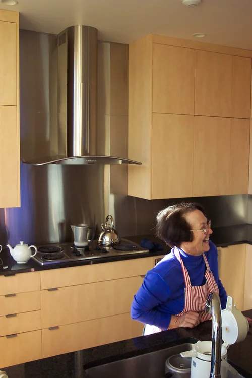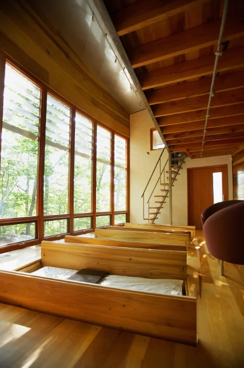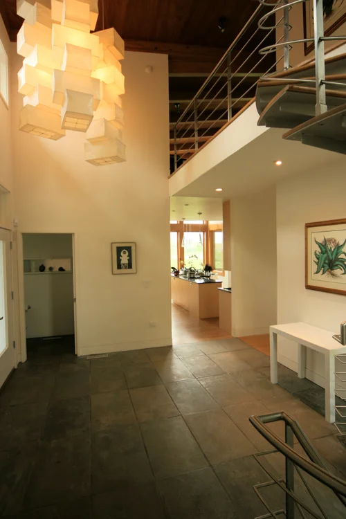 Throughout the home, the intermingling of glass, wood, concrete, metal, and stone provide contrast and interest as well as a soft, modern sensibility. Integral to the healthy house design are environmentally friendly and regional materials. Prior to specifying building materials, the clients had to give their approval by studying Material Safety Data Sheets (MSDS). Due to the wife's severe chemical sensitivities, she often slept with certain building materials and products in her room to determine if she would have an adverse reaction if those products were used in the construction of their new home. Toxic substances such as pesticides and fungicides were prohibited on site during construction. Stress-skin panels were utilized to expedite the framing in order to keep moisture out of the house while eliminating hidden pockets where molds can collect. The panels were also used for their energy efficiency. The concrete floors have a radiant floor heating system and also function as a passive solar heat sink. A sodium silicate was used to seal the floors. The mechanical system includes a heat recovery ventilator system to help filter new fresh air. All built-ins were made with substrates that had low or no volatile organic compounds (VOCs). The foundation was poured with Wesson Oil as a release agent and sealed off with Rub-R-Wall. The main strategy utilized was separation, ventilation, and filtration. Following through on this tactic was of great importance to the future health and happiness of the clients as well as to the success of this Healthy House.